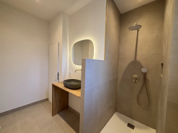 Il se compose d’une entrée, séjour avec cuisine ouverte, deux chambres et une salle de douche et wc séparé.