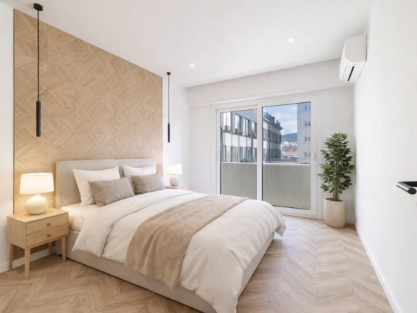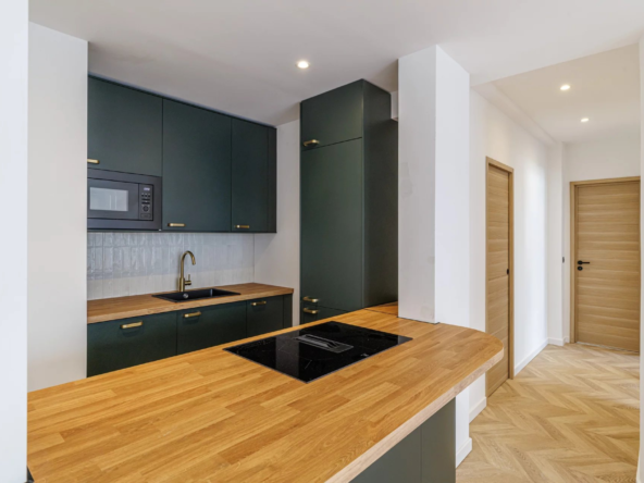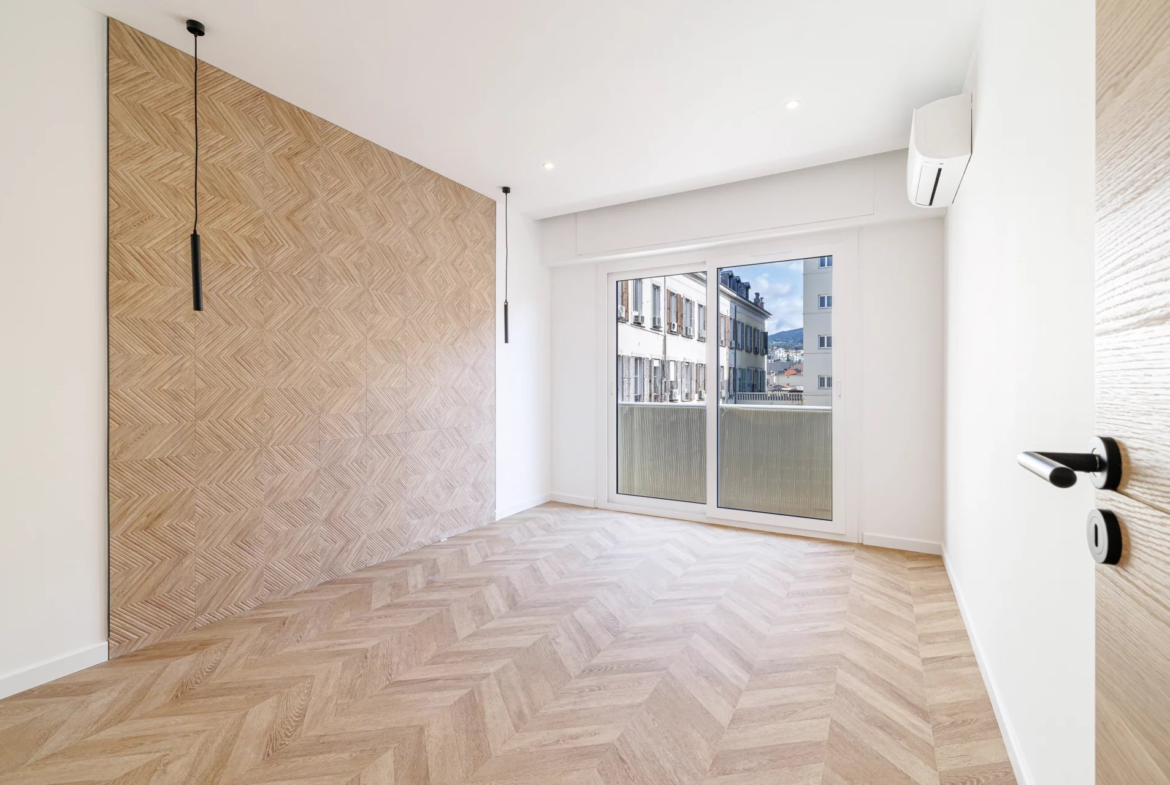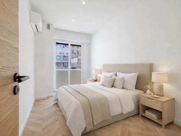 Dans un bel immeuble avec ascenseur, superbe appartement d’environ 60m2 entièrement rénové, composé d’un grand séjour avec cuisine ouverte, 2 chambres, salle de bains (douche et baignoire) WC séparés, superbes prestations (climatisation, double vitrage, etc…)