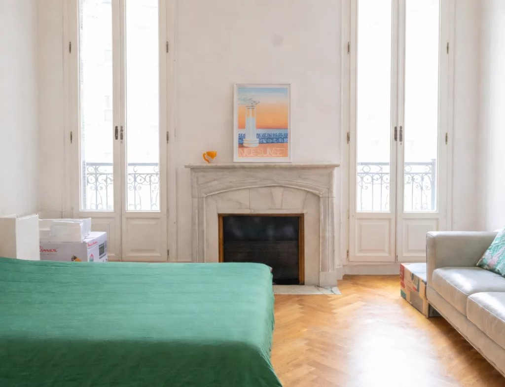 Il est situé au premier étage avec ascenseur, mais grâce aux hauts plafonds du bâtiment datant de la Belle Époque, on a l’impression d’être au deuxième étage et les nombreuses fenêtres laissent entrer le soleil.