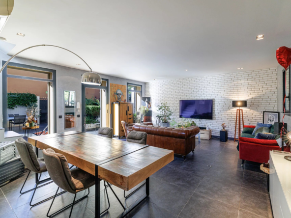 Un jardin paysager et une terrasse conviviale prolongent les espaces de vie pour profiter pleinement du climat méditerranéen. Deux cabanons de jardin complètent l’ensemble.