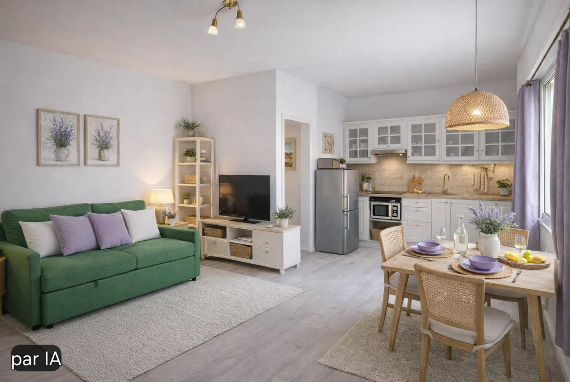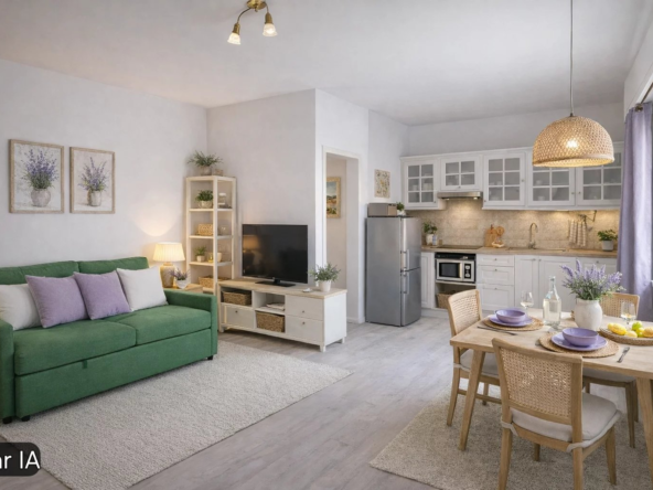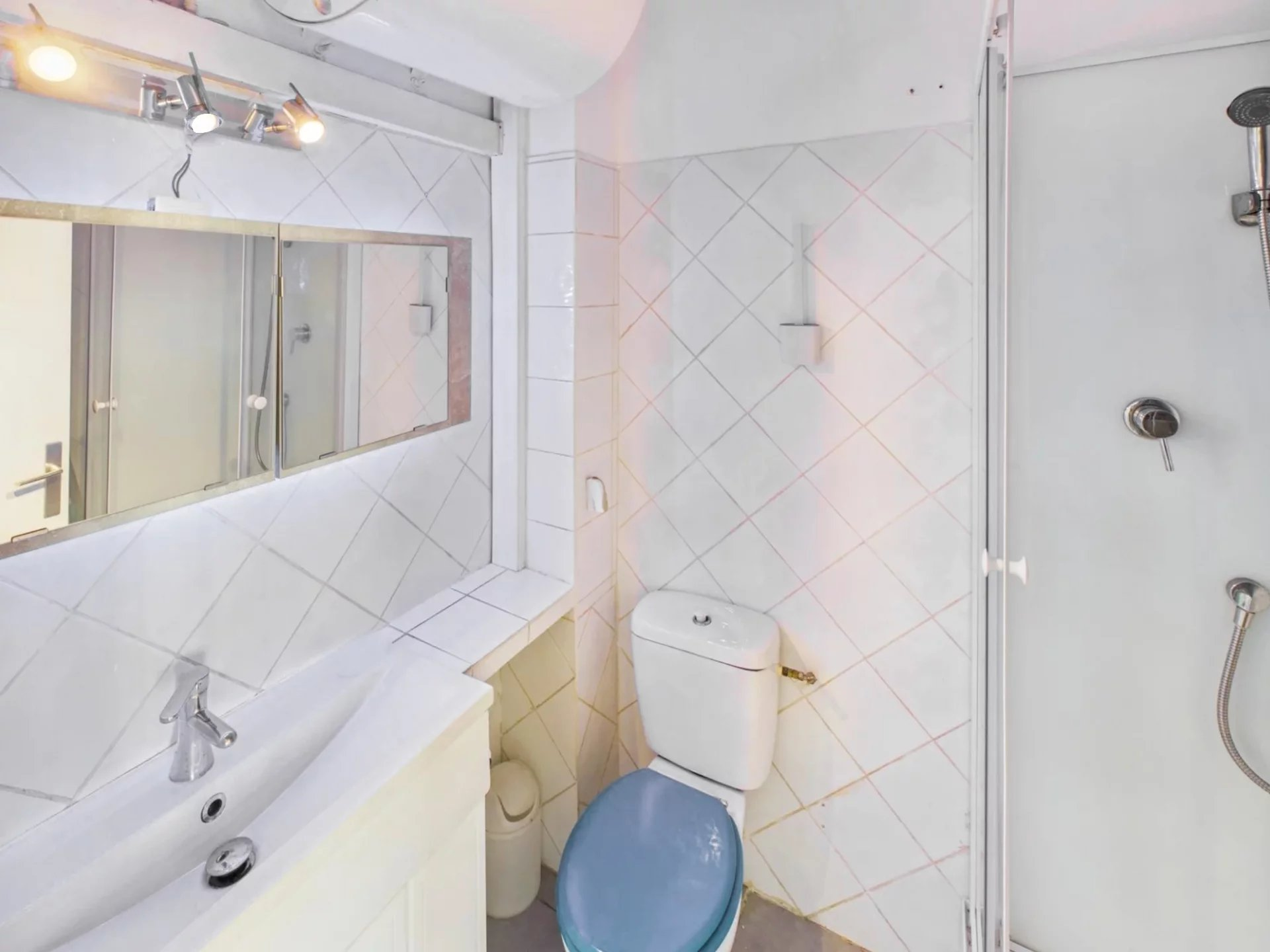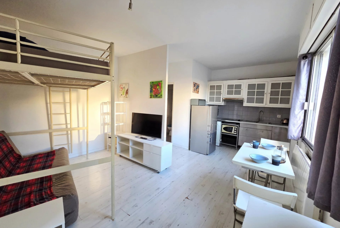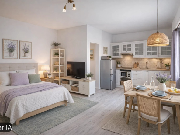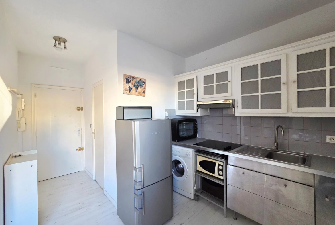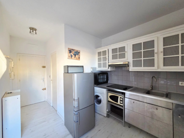 Ce joli studio se distingue par sa luminosité, son espace, une kitchenette fonctionnelle et optimisée avec Micro onde, Plaque de cuisson, Lave Linge, Lave Vaiselle, ainsi qu’une salle de douche avec WC.
