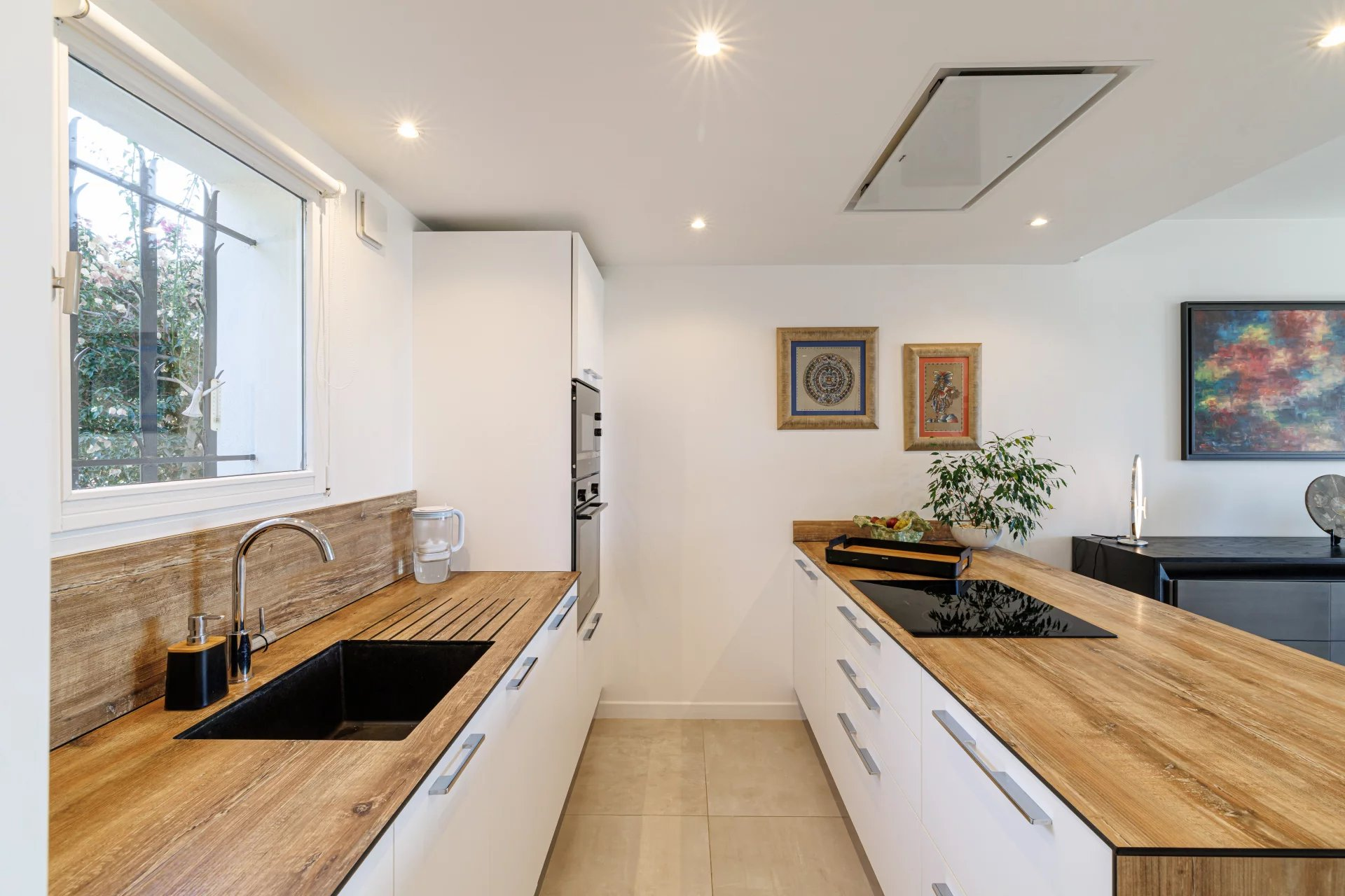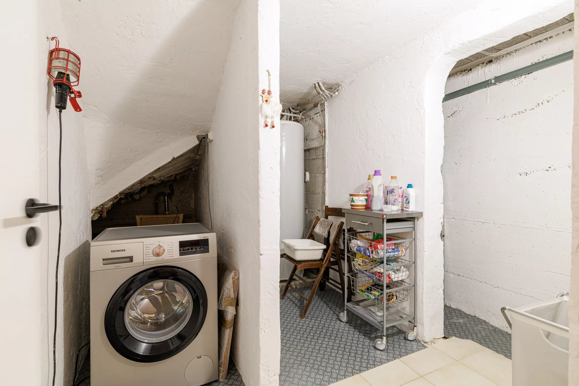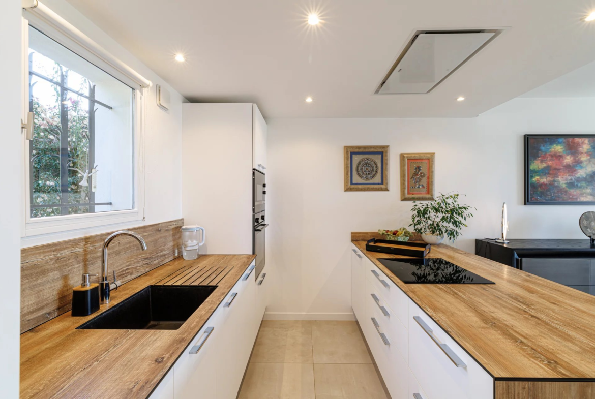 Abris de voiture dans la propriété, stationnement facile à proximité. Jardin total d’environ 200m2 avec une superbe cuisine d’été.