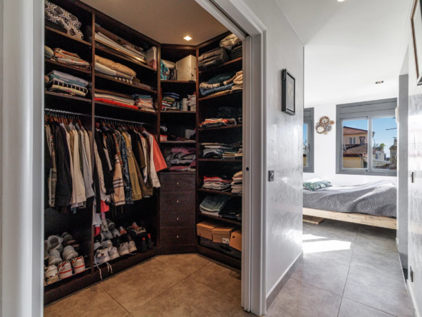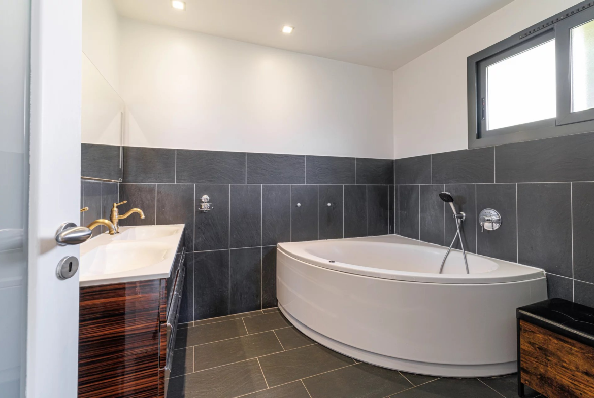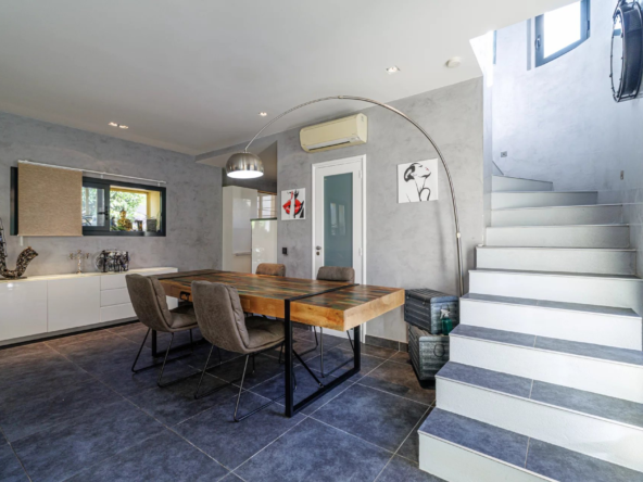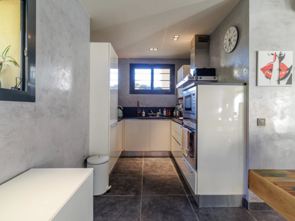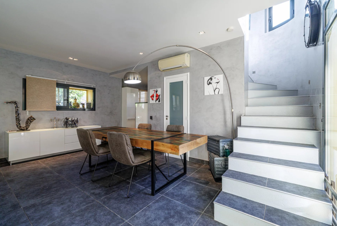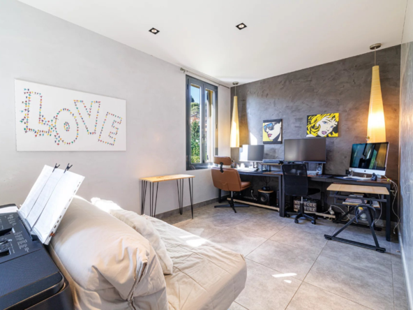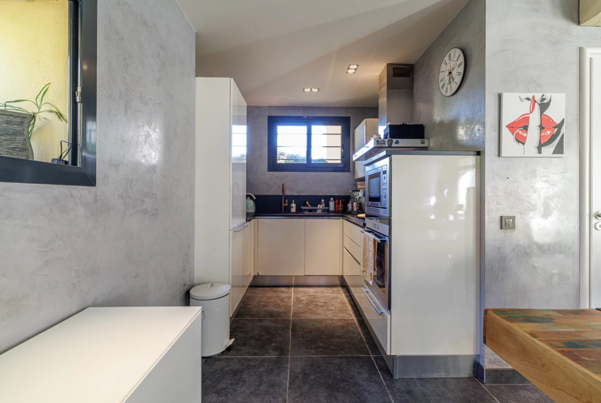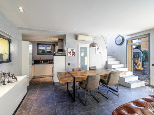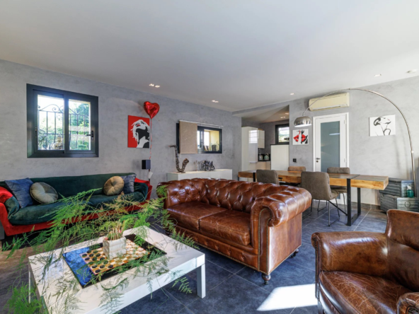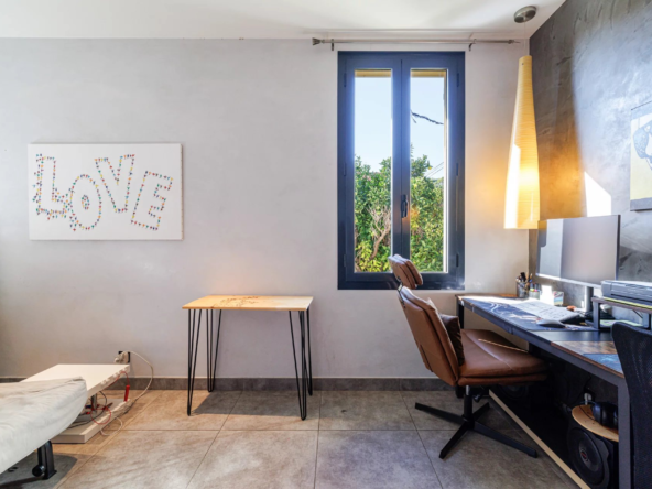 Un jardin paysager et une terrasse conviviale prolongent les espaces de vie pour profiter pleinement du climat méditerranéen. Deux cabanons de jardin complètent l’ensemble.