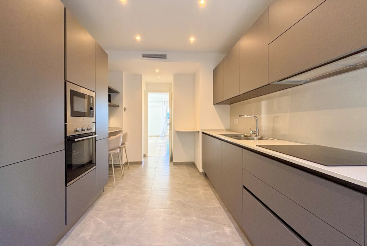 L’appartement s’ouvre sur une entrée menant à un vaste séjour d’angle de 50m2, baigné de lumière grâce à ses larges ouvertures. Une cuisine indépendante entièrement équipée, prolongée par une véranda semi-ouverte, complète l’espace de vie.