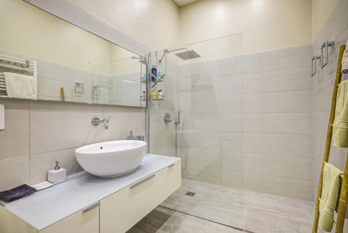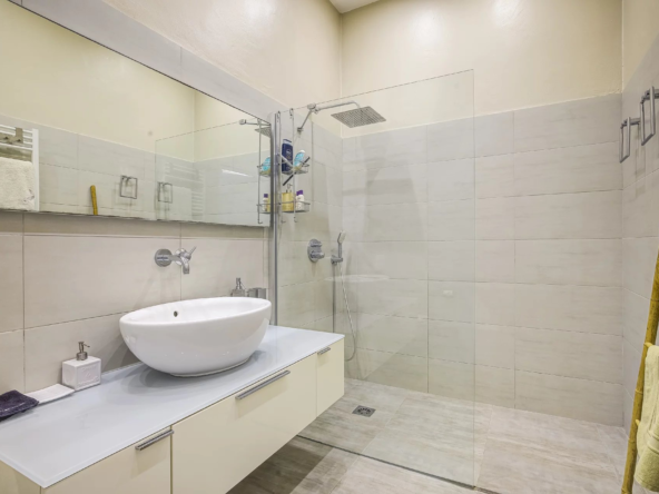 L’appartement principal comprend 2 chambres (dont 1 avec vue sur la mer), une grande salle de bains, un grand salon/salle à manger avec une cuisine ouverte haut de gamme.