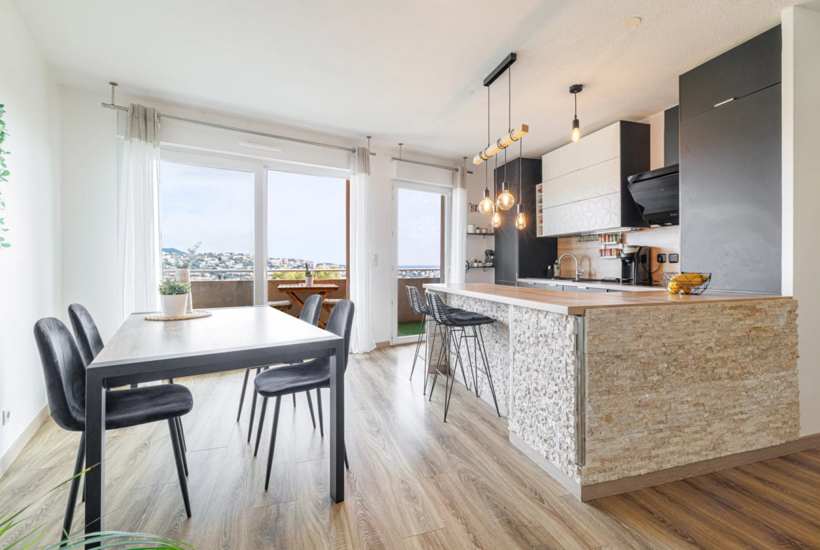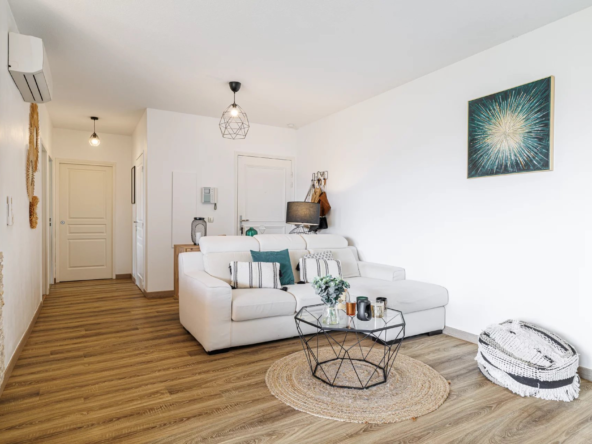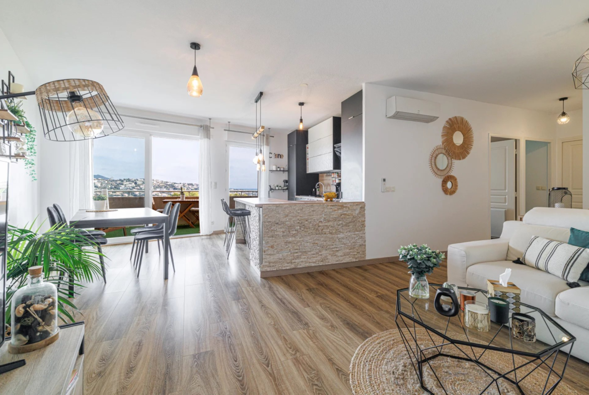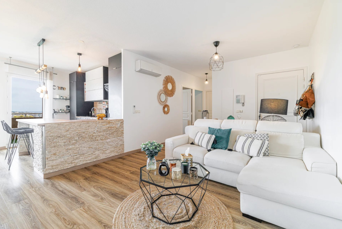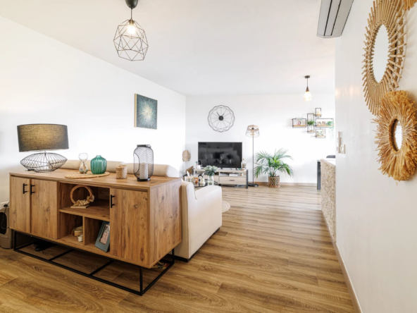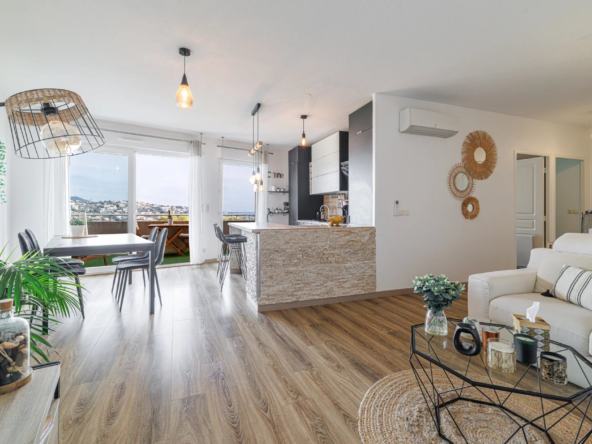 ST LAURENT DU VAR: Corniche Fahnestock, au dernier étage d’une très joli résidence contemporaine, sublime appartement d’environ 70m2 offrant un très grand séjour avec cuisine ouverte, belle terrasse ensoleillée de 12m2 à la vue panoramique et vue mer sans vis-à-vis, 2 chambres avec rangements, salle d’eau, WC séparés.
