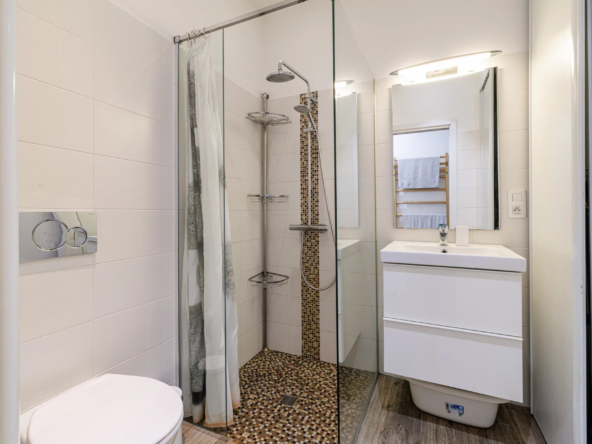 Climatisation, double vitrage, belles hauteurs sous plafond et finitions soignées viennent compléter le confort de cet appartement.